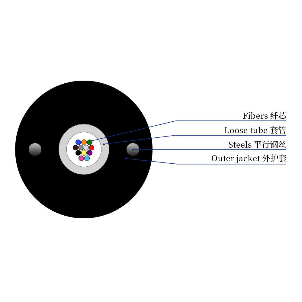 The core,9/125 is made of a loose casing with a high modulus of plastic.The casing is filled with waterproof ointment fillers.Place two FRP wires on both sides.Fiber optic cable with polyethylene (PE) sheath completed.